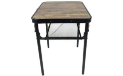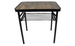 Ein stilvoller Aluminiumtisch im Industrie-Look mit einer Tischplatte in Holzoptik. Mit Hilfe der Stellschrauben können die Tischbeine an eine unebene Oberfläche angepasst werden. Darüber hinaus ist der Tisch durch die abnehmbaren Beine sehr kompakt. Der Tisch ist mit einem Netz unter der Mitteldichte Holzfaserplatte-Tischplatte zur Aufbewahrung von Gegenständen und einem Griff ausgestattet.