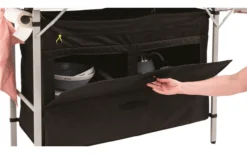 Mit dem Magante-Küchenblock haben Sie alles ordentlich und schnell zur Hand. Zwei Ablagen, Haken und ein magnetischer Messerhalter an der Rückwand sorgen für Stauraum in der Camp-Küche und bringen ein schickes Kacheldesign auf jeden Stellplatz. Mit einer Arbeitsplattenhöhe von 90 cm und einem stabilen Sockel bringen wir den Komfort der heimischen Küche in die Essenszubereitung im Freien.